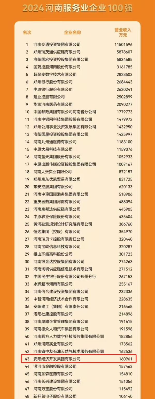 近日,集團在河南企業(yè)100強高峰會上入選“2024河南服務(wù)業(yè)企業(yè)100強”,位列榜單第43位,這是集團連續(xù)第3年獲此榮譽。