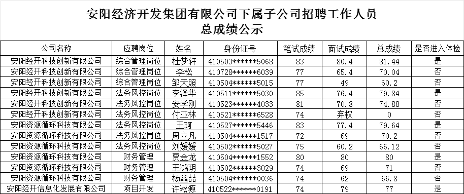 根據(jù)《安陽經(jīng)濟(jì)開發(fā)集團(tuán)有限公司下屬子公司工作人員招聘公告》的考試規(guī)則,現(xiàn)將綜合成績公示。請進(jìn)入體檢人員保持電話暢通。